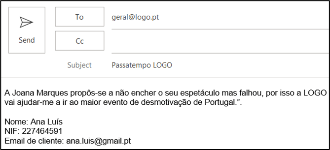 - Conteúdo do email: Frase criativa com as palavras “LOGO” e “Joana” que explique por que motivo mereces ir ao espetáculo “Desconfia – Joana Marques” com o apoio da LOGO. Primeiro e último Nome, NIF, e Email de cliente (o email associado ao perfil de cliente LOGO).